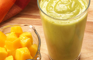 In jar of blender or food processor, combine avocado, mango, juice and water; whirl until smooth. Divide among chilled glasses.